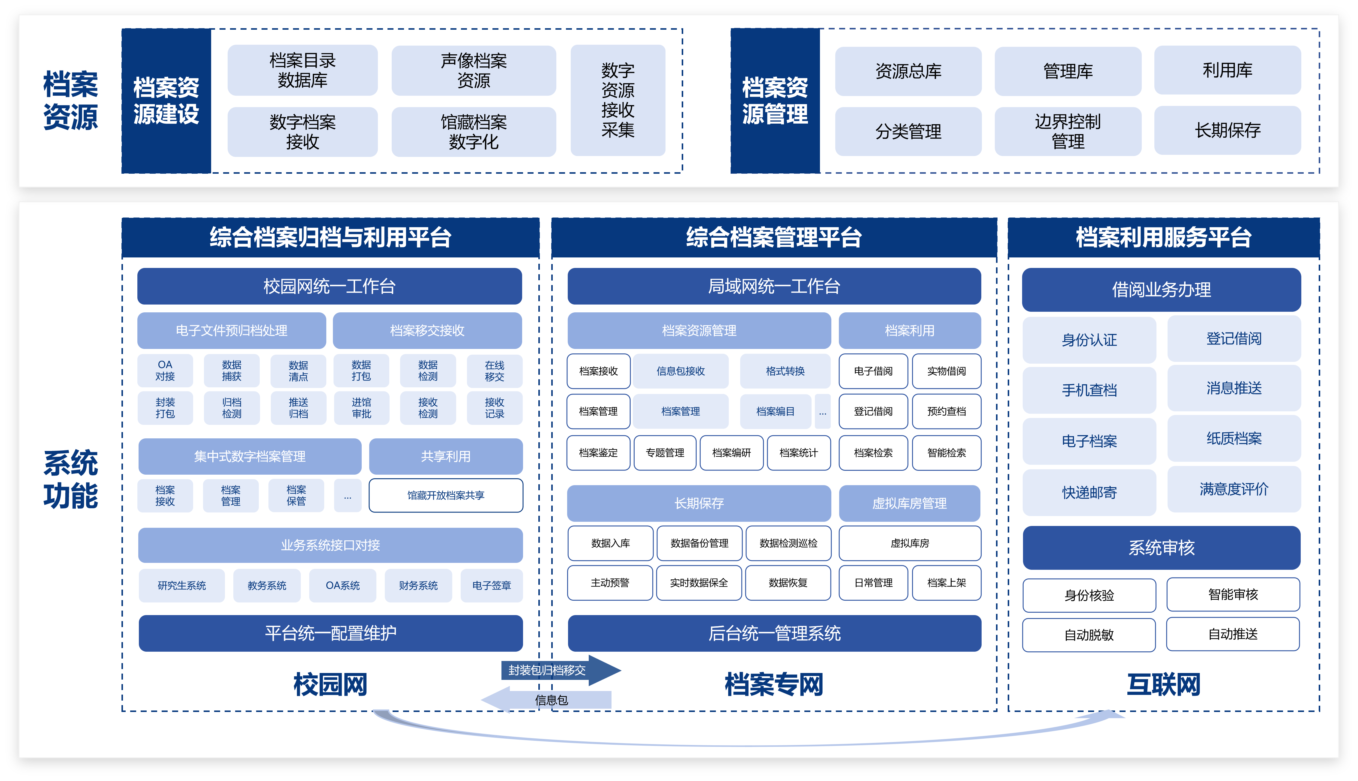 为达成国家级数字档案馆建设标准,需实现局域网、校园网、互联网的三网隔离部署,同时满足电子档案“四性检测”(真实性、完整性、可用性、安全性)要求,原有系统缺乏合规化、安全化管控能力。