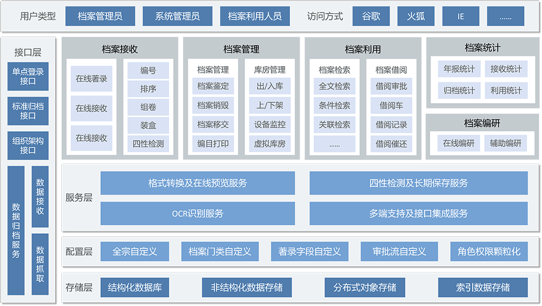 ● 提升业务效率:建立电子档案业务全生命周期管理,系统替代人工,自动采集替代手工录入;线上查阅替代线下借阅,提效节能;