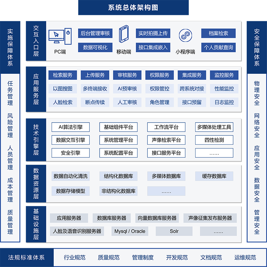 全程留影平台(声像档案管理):搭建PC端、校园App、微信小程序多渠道上传入口,师生校友可实时拍摄或批量上传声像资源;集成人脸识别、语音转写、OCR识别技术,实现档案自动标注元数据、智能审核分类,支持以图搜图、语义检索、人脸检索三种模式,达成10万级档案秒级响应;设有归档排行界面,各部门、学院归档量可视化呈现,激发归档积极性。在实现声像档案收集管理的同时,通过声像展示平台传播校园文化。