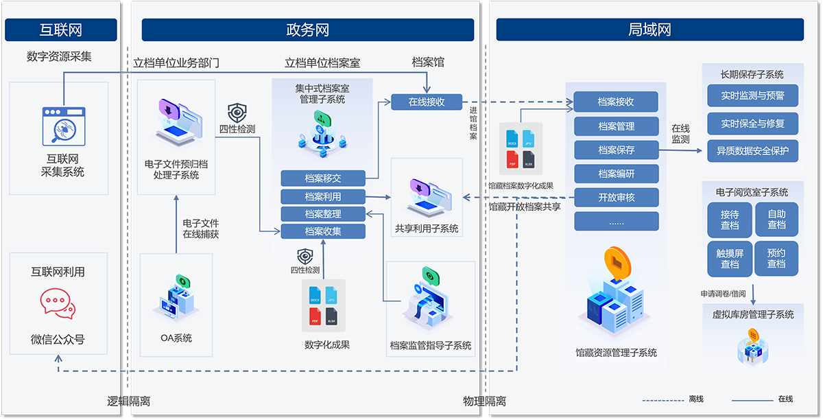 三网隔离架构部署:严格遵循数字档案馆建设标准,实现局域网、政务外网、互联网物理/逻辑隔离,按“内网管存、外网协同、互联网服务”原则分配功能: