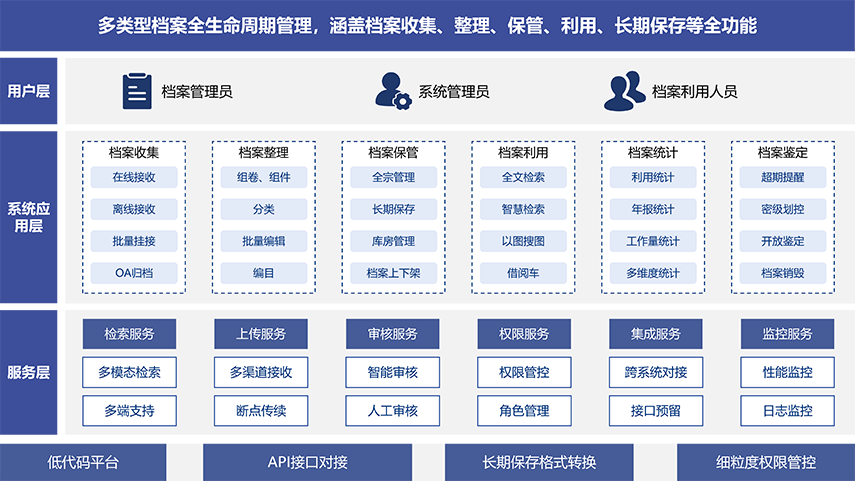 ● 管理成本高:声像档案人工审核、元数据补全耗时费力,单条档案处理周期长;综合档案门类繁杂,缺乏统一管理平台,权限管控、长期保存等环节规范性不足。