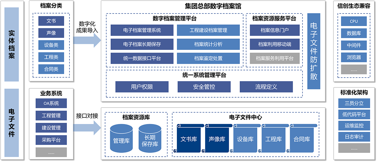 集团化管理难度大,本部与10家所属单位跨区域分布,档案管理标准不统一,传统模式下难以实现集中管控,档案资源分散,无法形成协同利用体系;