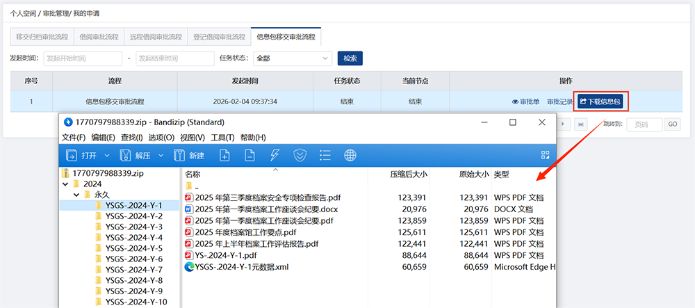 机关档案规范移交平台:在政务外网部署电子档案移交接收平台,内置四性检测工具,机关单位移交归档档案时,系统生成四性检测报告,生成归档移交单,同时生成符合DA/T 48-2009标准的封装包,实现电子档案离线归档,符合《推进数字档案馆建设实施办法(试行)》建设标准规范。
