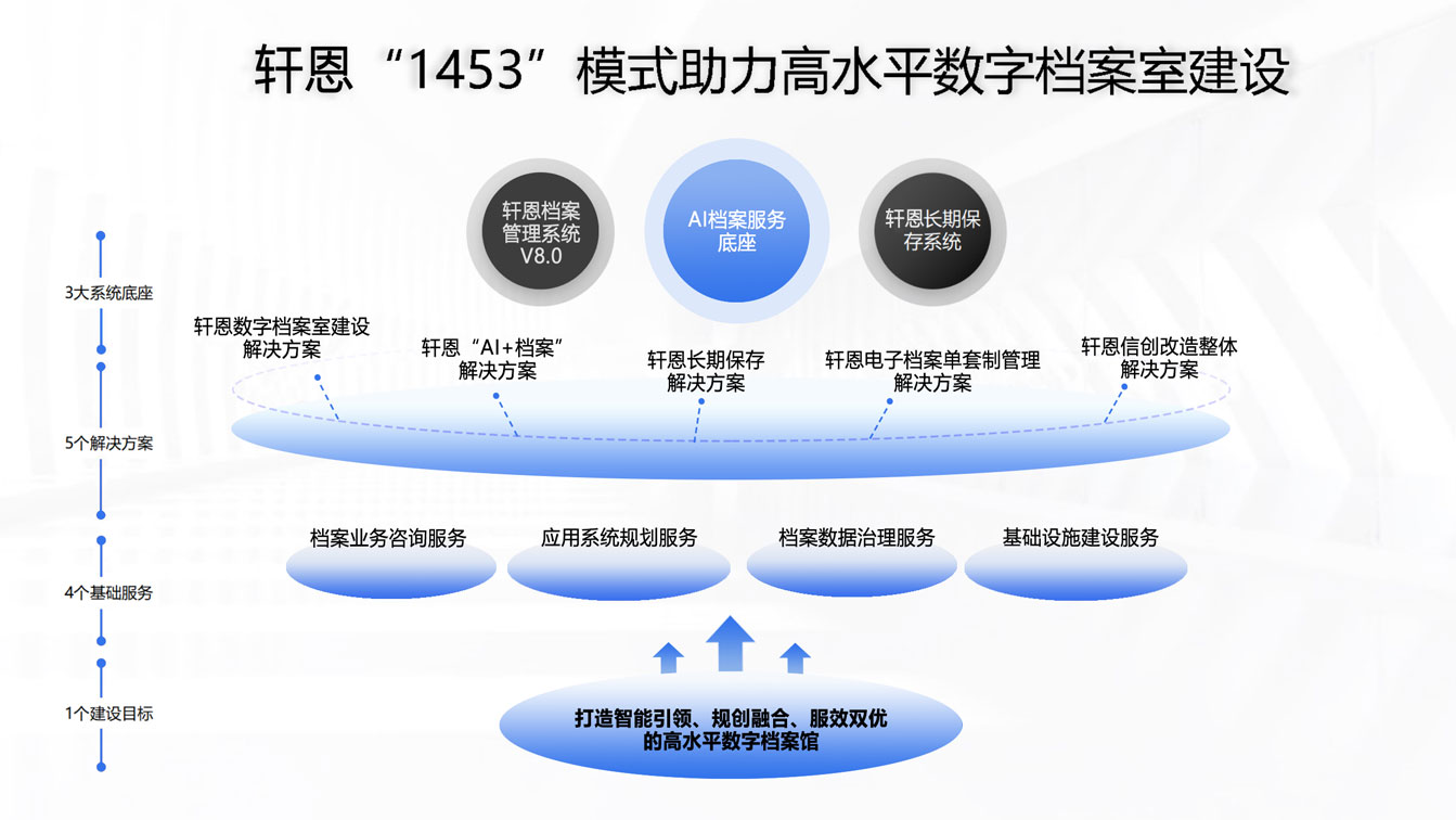 为深入贯彻《数字档案室建设指南》《推进机关数字档案室建设实施办法(试行)》等政策要求,助力机关、企事业(团体)实现数字档案室建设从“合规基础”到“智慧升级”的跨越式发展,光典依托国家级、省级数字档案室测评的实战经验沉淀,以自主研发的“1453”高水平数字档案室整体解决方案为核心框架,构建“全流程覆盖、全要素保障、全层次协同”的三维服务体系,为客户提供从顶层设计到测评认证的一站式闭环服务,加速推动档案管理向智能化、集约化、标杆化转型。